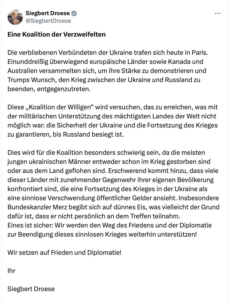 Aber er verbreitet nur Kreml Propaganda: „Aus der Friedensunion ist eine Kriegsunion geworden“ & „Kriegstrommeln schlagend, tourt Kommissionspräsidentin Ursula von der Leyen unbeirrt durch Osteuropa.“ Sein Slogan „Droese die EU ist Böse“ zeigt das Niveau seiner Analyse.