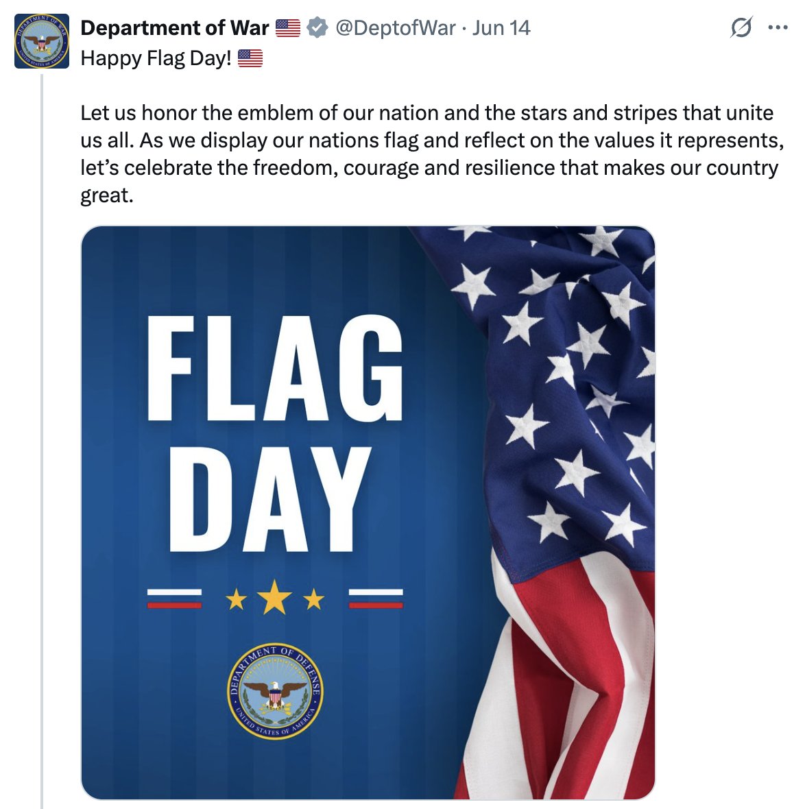 ![“As we display our nations [sic] flag and reflect on the values it represents, let’s celebrate the freedom, courage and resilience that makes [sic] our country great.” https://x.com/DeptofWar/status/1933947548965781863](/media/images/twitter/G3yRoCLW4AAYljk.jpg)