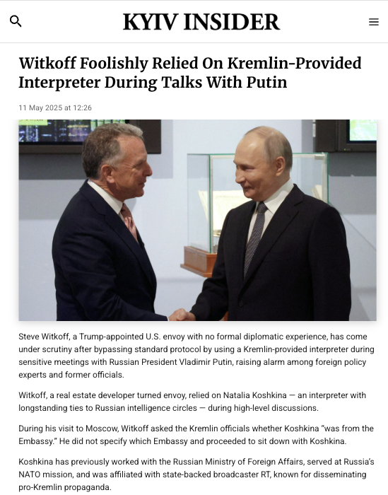 In fact, it turns out that the plan was written by Russians, in Russia, in Russian. Holding crucial talks without any note-takers or American interpreters, lacking any training in political negotiations, Witkoff has breached diplomatic protocol and sidelined anyone reasonable still left in the US government.