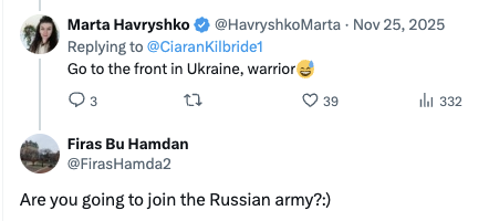 Marta often encourages pro-Ukraine activists to “go to the front.” Of course, some are already there, and one of them urged her to at least raise funds for Ukrainian children or civilians. Instead of helping, she accused him of “stalking,” and as far as we know Ms Havryshko has raised a grand total of 0€ for Ukraine.