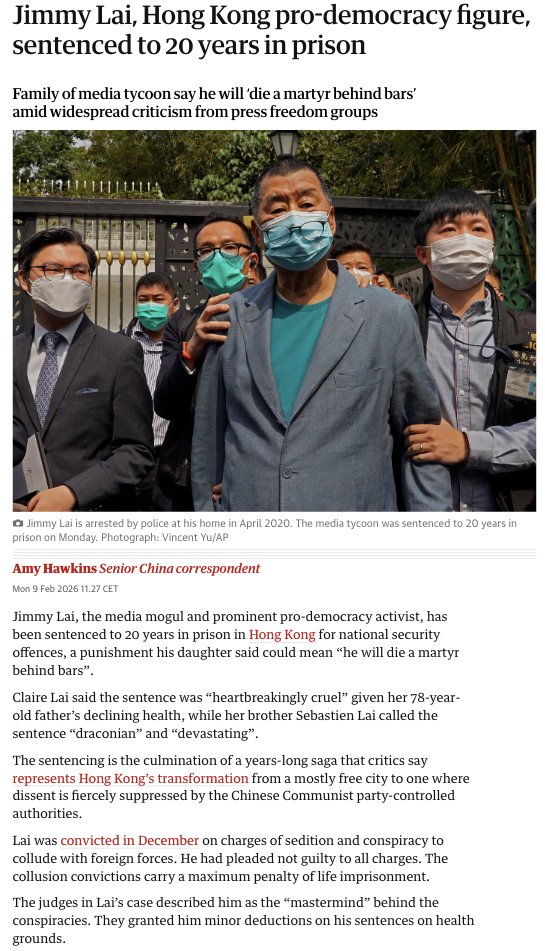 - Jimmy Lai, Hong Kong pro-democracy figure, sentenced to 20 years in prison