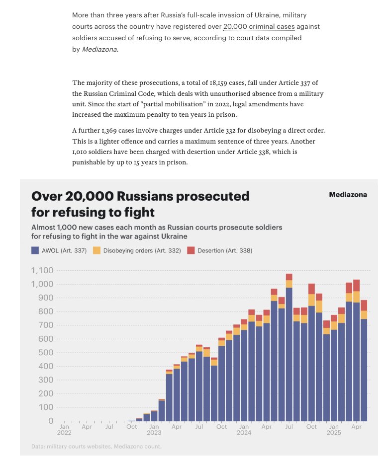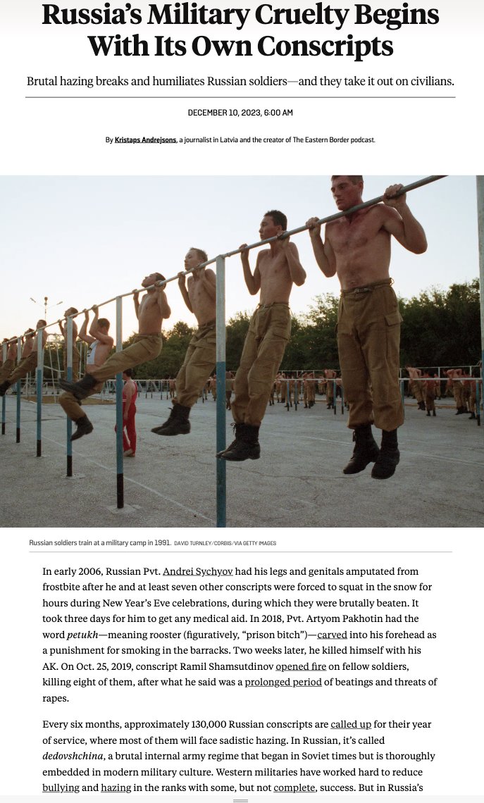 Russian conscripts are brutally hazed (“dedovshchina”), and while Putin initially denied that conscripts would be sent to the front, refuseniks now face 10 years in prison and inhumane punishments.