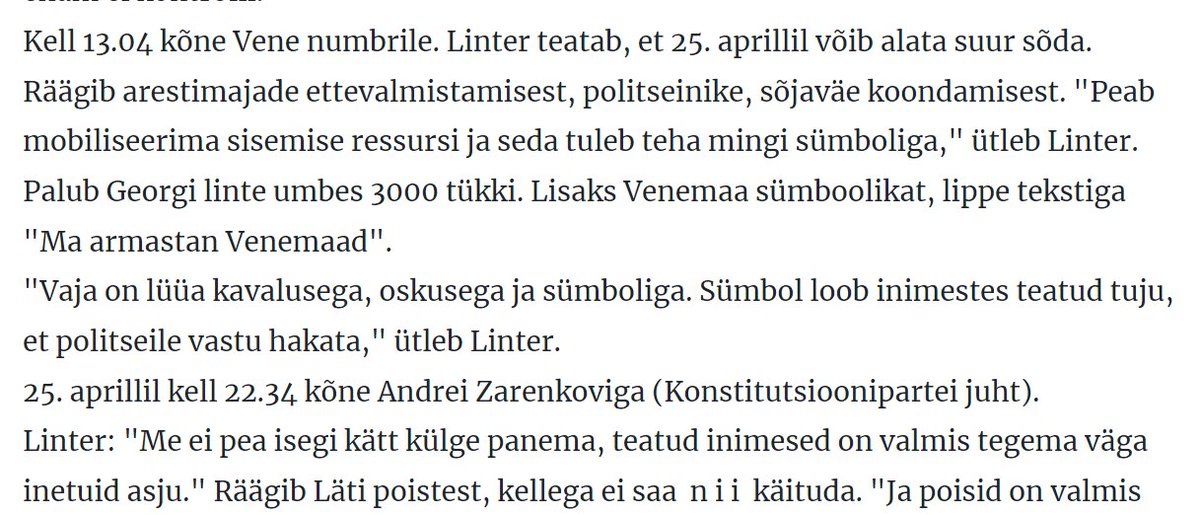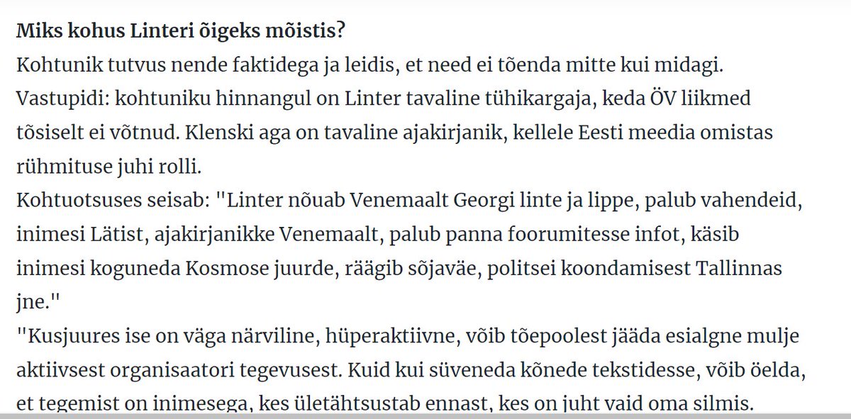 Linter esitab Venemaale Eesti kohta absurdseid valesüüdistusi. 2022. aasta aprillis andis Linter intervjuu Venemaa väljaandele, kus kurtis russofoobia pärast Eestis. Mh kurtis ta, et Tapal asub “salajane” sõjaväebaas, kuhu “saaks tuua tuumapommid!”