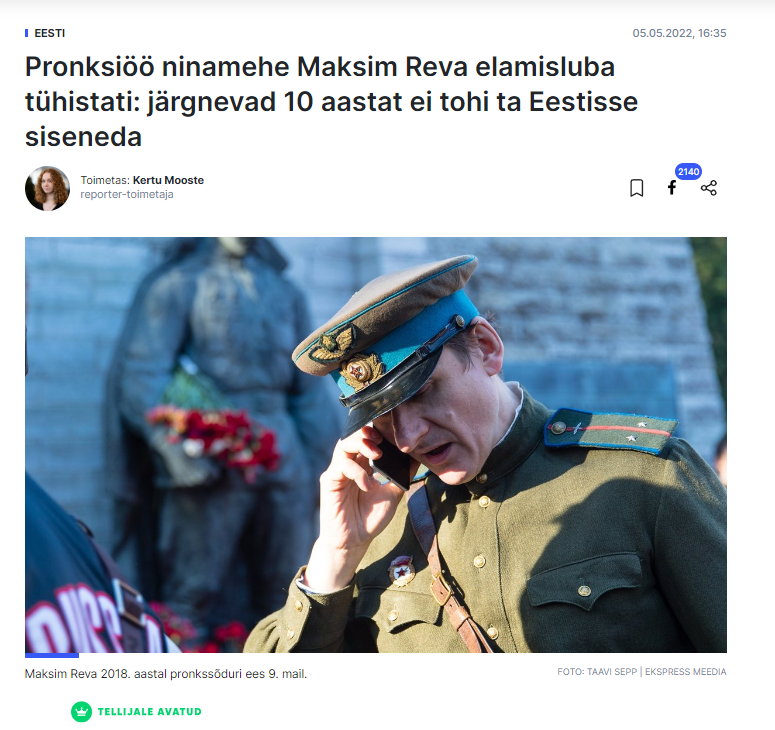 End pärast pronksiööd pea igal 9. mail “täisvormis” Aljoša juurde kohale vedanud Maksim Reva kohta avaldati viimane teade Eestis 2022. aasta mais, kui “julgeolekuohust tingituna” tühistati tema elamisluba ning ta saadeti Venemaale.
