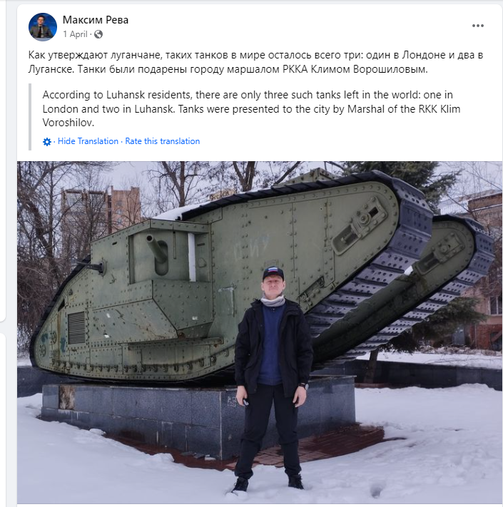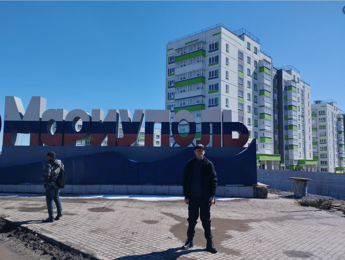 Reva tuuritas tänavu kevadel okupeeritud Ida-Ukrainas, peas Venemaa lipuga müts; ka Mariupoli linna silt on värvitud samadesse värvidesse ning Reva on selle üle mõistagi rõõmus.