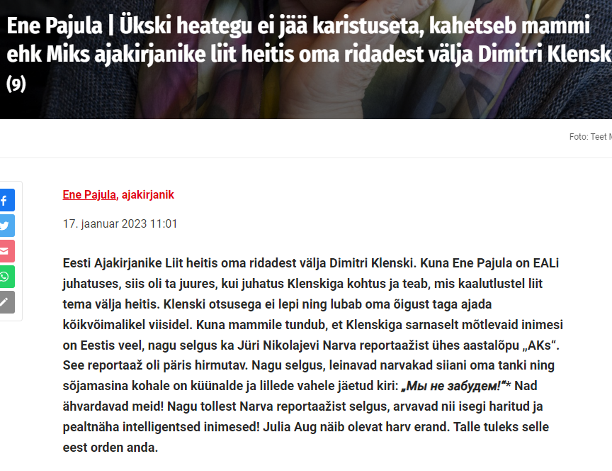 Kuni 2023. aastani oli ta mu mu üllatuseks Eesti Ajakirjanike Liidu liige (mina nt ei ole), kus ta propaganda tegemise eest välja visati.