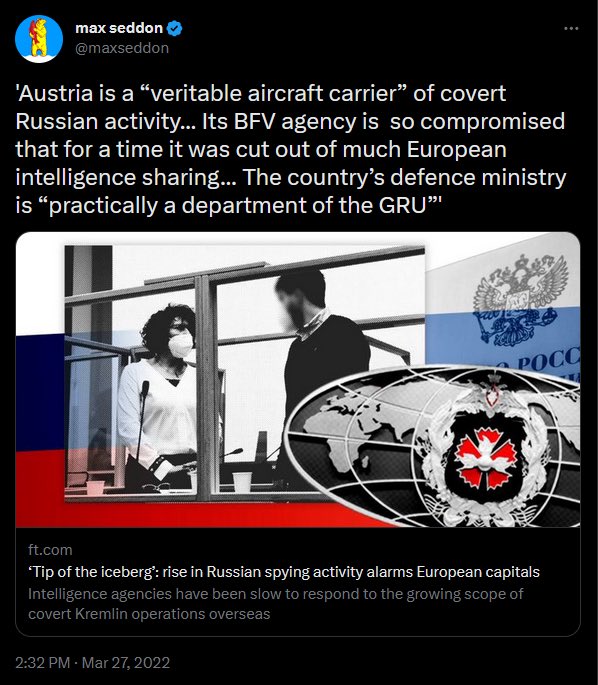 🇦🇹 war das 1. westliche Land, das Putin nach der Annexion der Krim 2014 zu einem Besuch einlud. 🇷🇺 hat auch die 🇦🇹 Politik beeinflusst, insbesondere die nationalkonservative FPÖ. Wie in Deutschland sind mehrere hochrangige österreichische Politiker & Beamte in die…