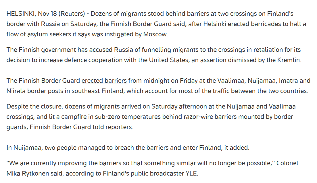 On 18 November 2023, Finland decided to close four of it’s border crossings & made asylum seeking possible only in two crossings further up north. Finance Minister Riikka Purra said Thursday that Finland was ready to close all crossing points on the Russian border if necessary.