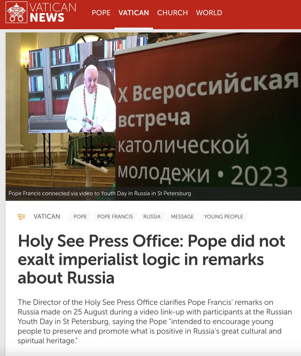 En agosto de 2023, el sumo pontífice se expresó por videoconferencia en el X Encuentro nacional de jóvenes católicos rusos en San Petersburgo. Durante su discurso, se dirigió a los jóvenes diciéndoles: «Ustedes son los herederos de la gran Rusia: 15/34