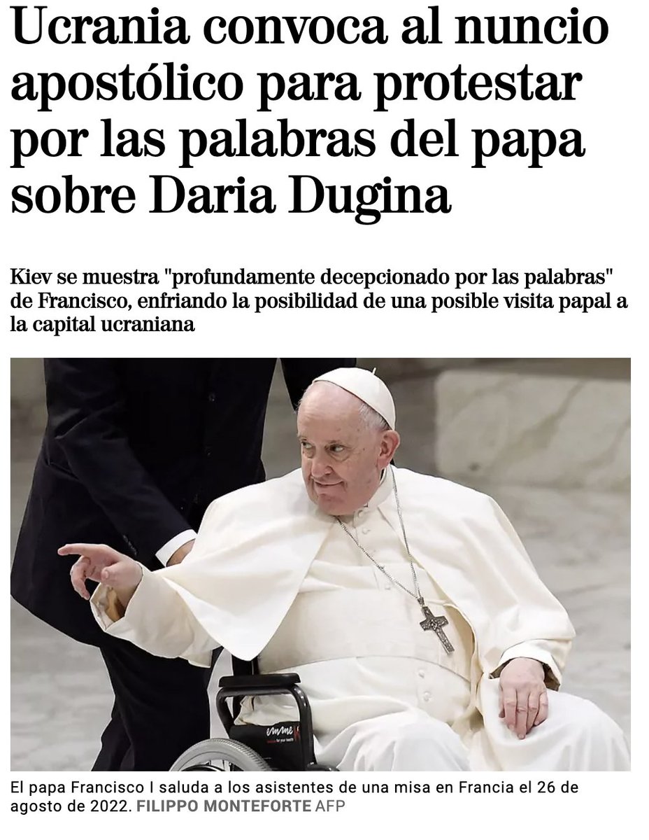 En agosto de 2022, Francisco describió el asesinato de la hija de Aleksandr Duguin, Daria Duguina, como «esa desafortunada joven que murió a causa de una bomba bajo el asiento de su coche en Moscú. ¡Los inocentes pagan por la guerra, los inocentes!». 7/34