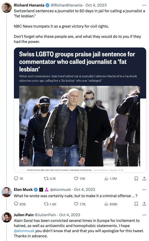 … d’Aaron Greenspan, critique à la fois de Tesla et de Musk. Son projet, PlainSite, qui partage gratuitement des dossiers judiciaires, a également été suspendu sur X. Idem pour Eric John Diesel, qui a documenté les tweets racistes de Musk.