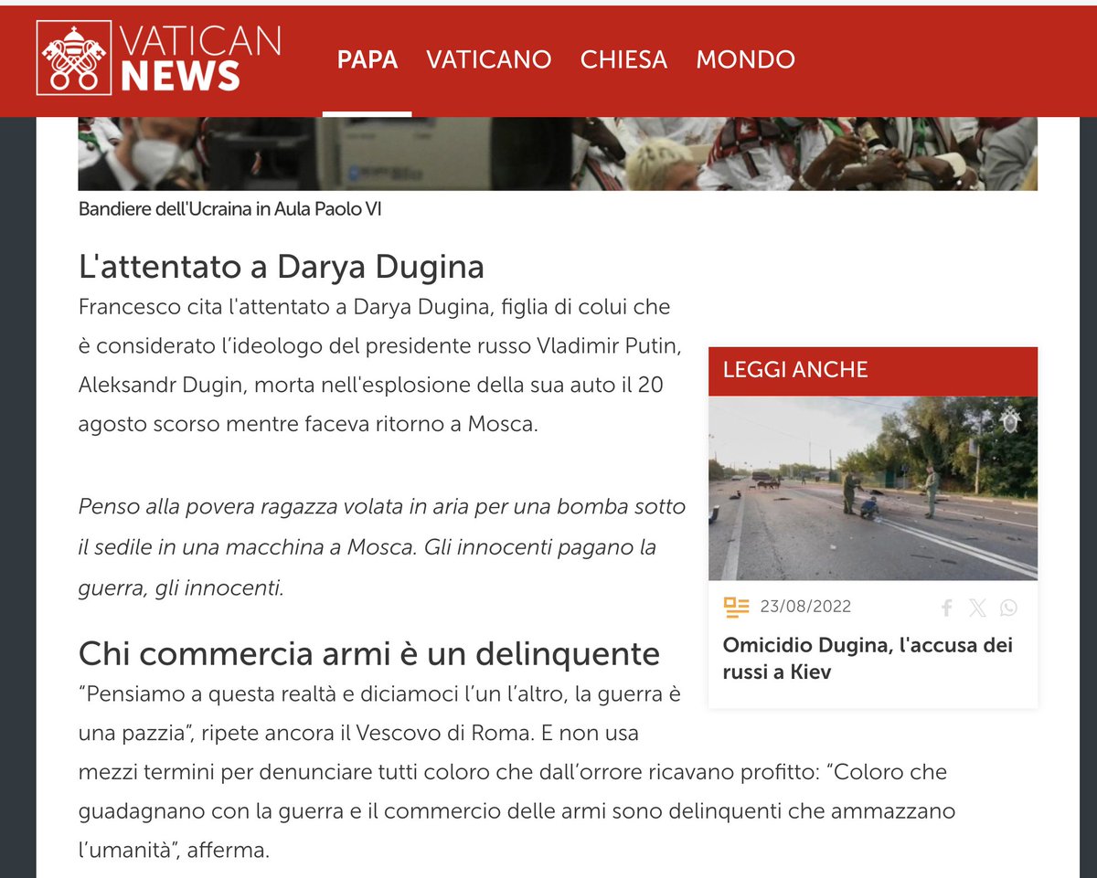 En août 2022, François a décrit le meurtre de la fille d’Alexandre Douguine, Daria Douguina, comme « cette malheureuse jeune femme qui est morte à cause d’une bombe sous le siège de sa voiture à Moscou. Les innocents paient pour la guerre, les innocents ! ».
