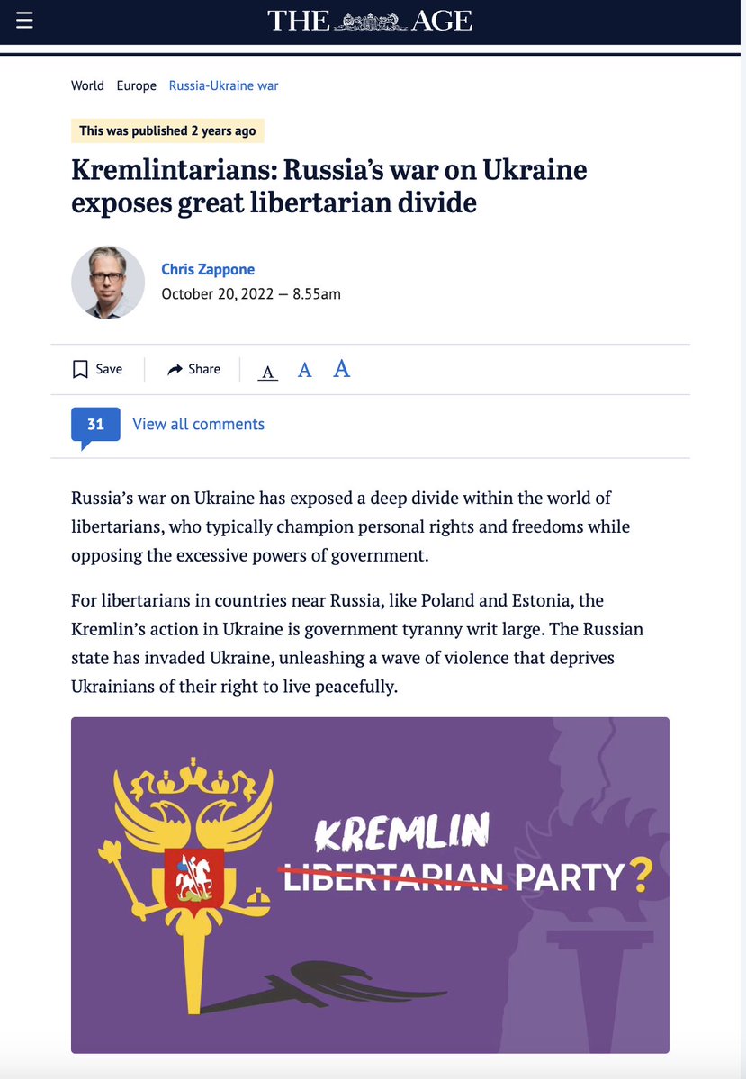 …censé être fondé sur la liberté individuelle et la non-agression — violées par l’invasion et l’occupation russes. « Kremlintariens » va mieux, popularisé notamment par @GrandTurion, @liberpediaorg et @chrizap : « la grande fracture libertarienne ».