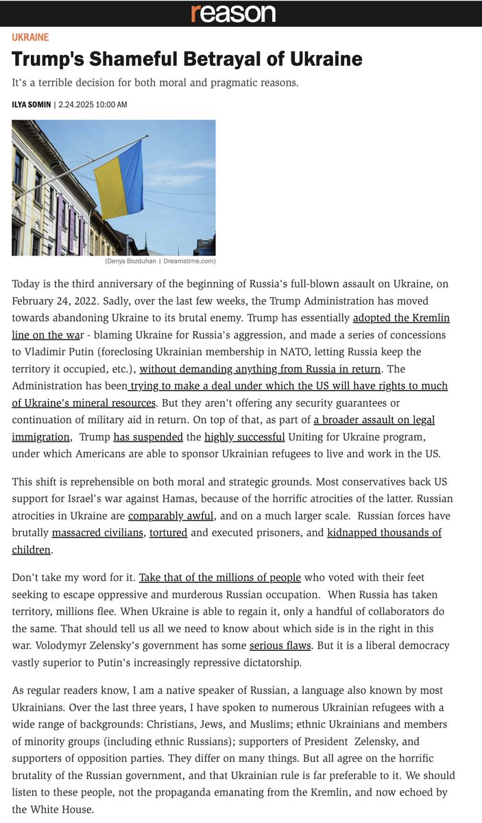 Reason (magazine libertarien haï de McArdle) : « La trahison honteuse de Trump envers l’Ukraine ». Trump a même poussé Javier Milei, libertarien argentin qui semblait jusqu’ici sincèrement apprécier Zelensky, à trahir l’Ukraine à son tour.