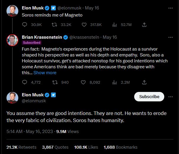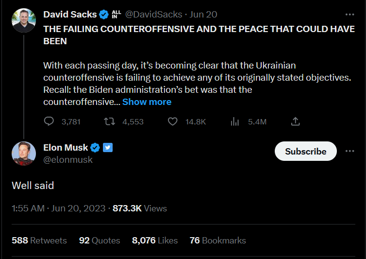 In juni 2023 trakteerde David Sachs ons op een nieuwe lange tweet waarbij hij het tegenoffensief van de Oekraïners veroordeelt terwijl John Mearsheimers realpolitiekonzin de hemel in wordt geprezen. Musk is het er volmondig mee eens en brandt en passant ook Bellingcat af.